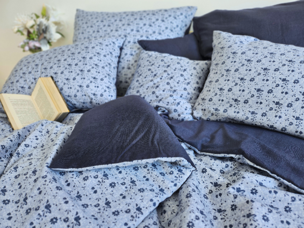Povlečení s drobnými modrými květy a jednobarevnou modrou