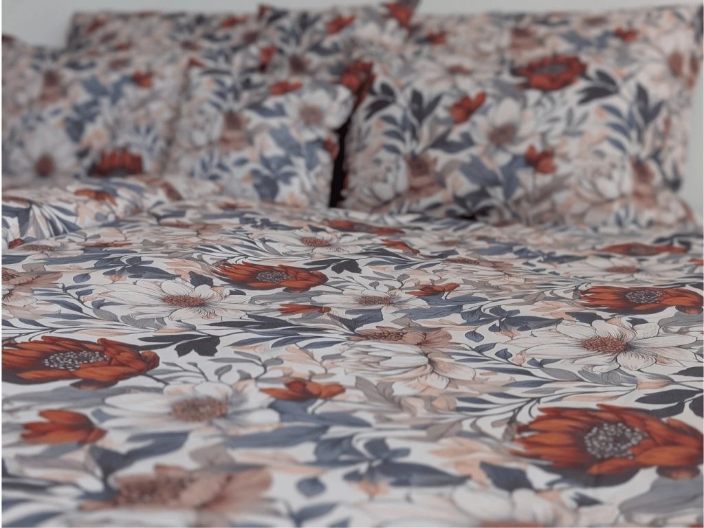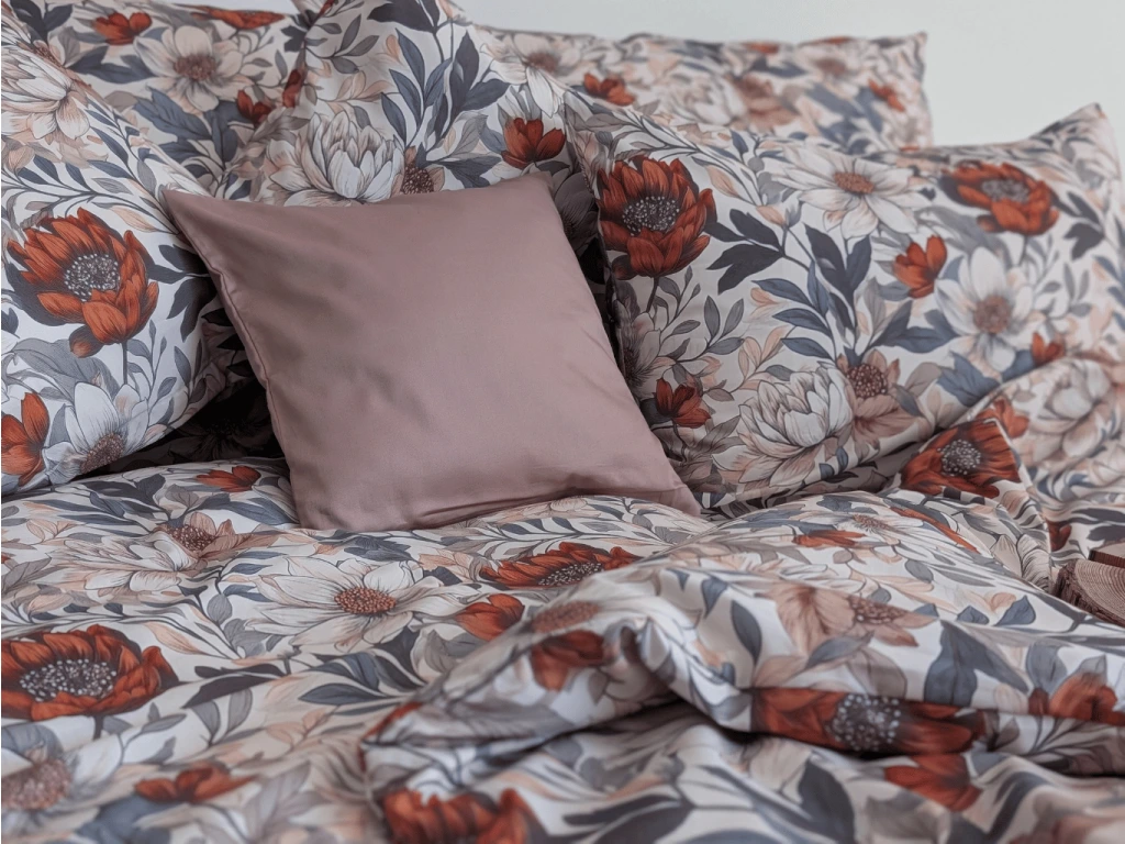 Květinový vzor v jemném, tlumeném odstínu navodí v ložnici harmonii a klid. Jedná se o náš autorský tisk, který jinde nenajdete – originální design, který dodává povlečení výjimečný charakter.