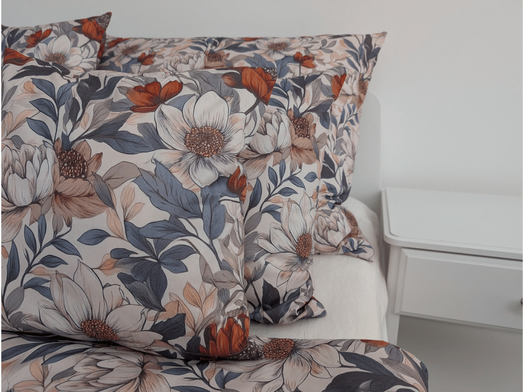 Květinový vzor v jemném, tlumeném odstínu navodí v ložnici harmonii a klid. Jedná se o náš autorský tisk, který jinde nenajdete – originální design, který dodává povlečení výjimečný charakter.