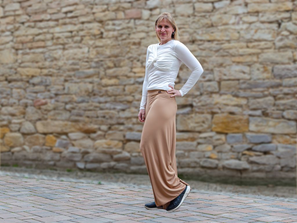 - Široký volný pas: Pohodlný pas se přizpůsobí postavě a lze ho podle potřeby ohrnout. Nikde netlačí a neomezuje pohyb.