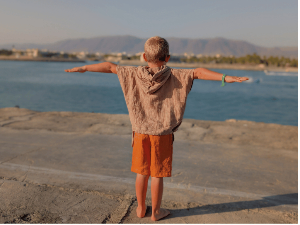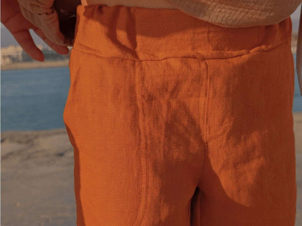 Veselé, hravé a nepřehlédnutelné – oranžové lněné kraťasy přinesou do dětského šatníku barvu i radost. Ušité z 100% přírodního lnu s certifikací OEKO-TEX®, který je hypoalergenní, prodyšný a rychleschnoucí, takže se hodí jak na letní dobrodružství, tak i na slavnostnější příležitosti. Pružný pas na gumu zajišťuje pohodlí při pohybu, dvě kapsy zase místo na dětské poklady z výletů.