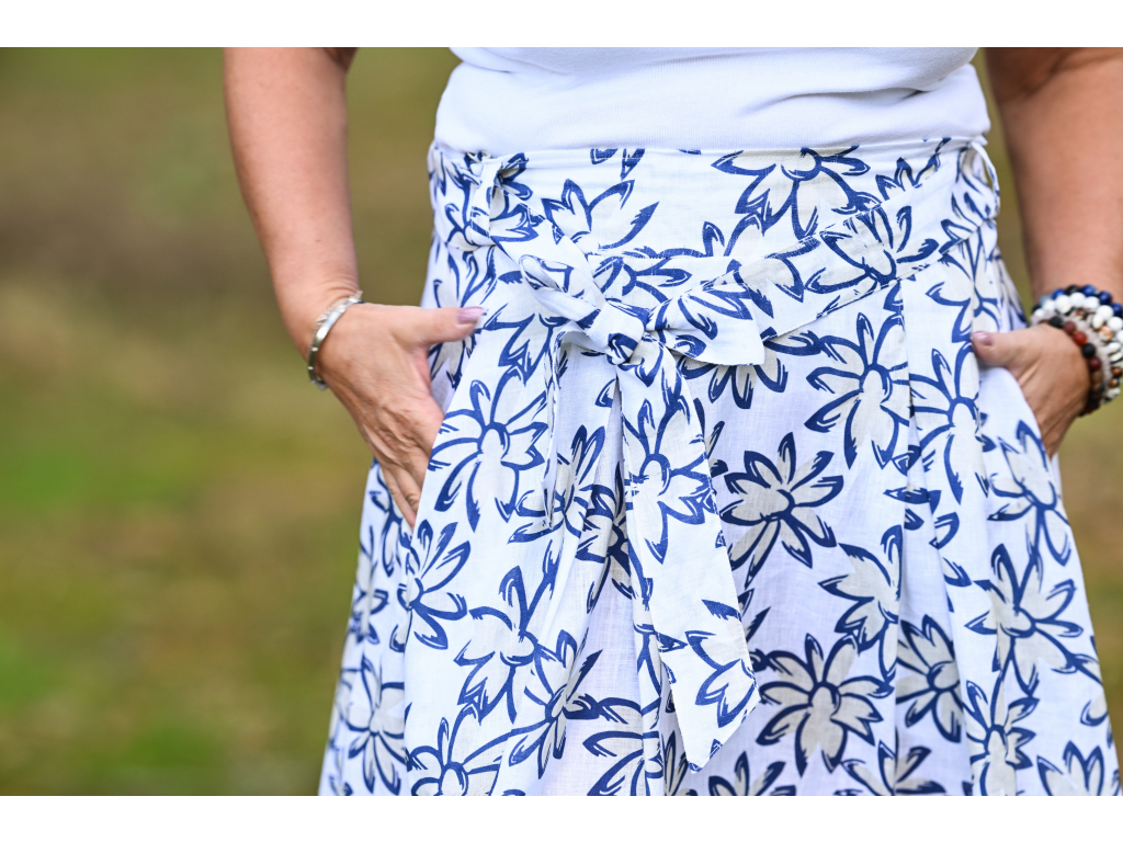 Zažijte kouzlo letní lehkosti v sukni, která spojuje čistotu bílého lnu s něžným modrým květinovým detailem.