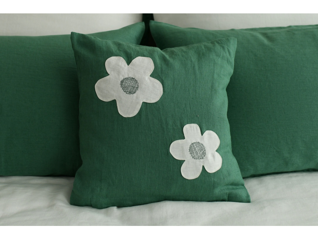 Lněný dekorativní povlak na polštář - bílé květy na zeleném