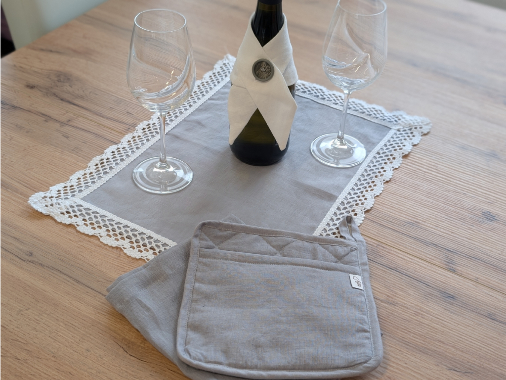 Lněné prostírání ve světle šedém odstínu s jemnou krajkou
