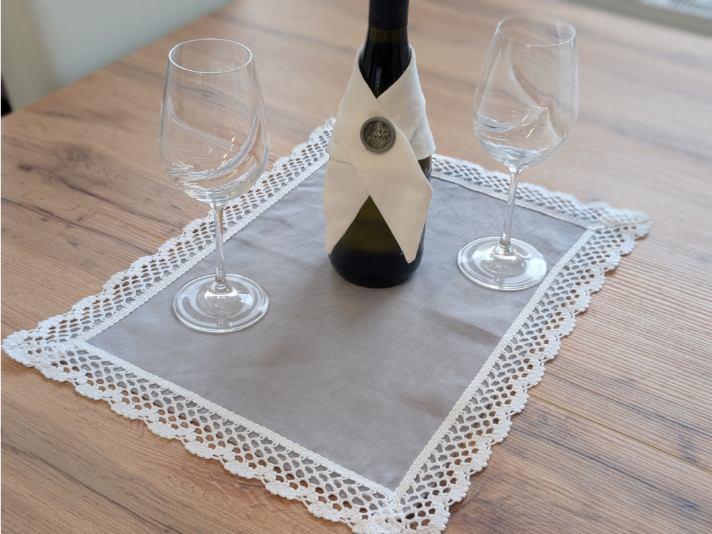 Lněné prostírání ve světle šedém odstínu s jemnou krajkou