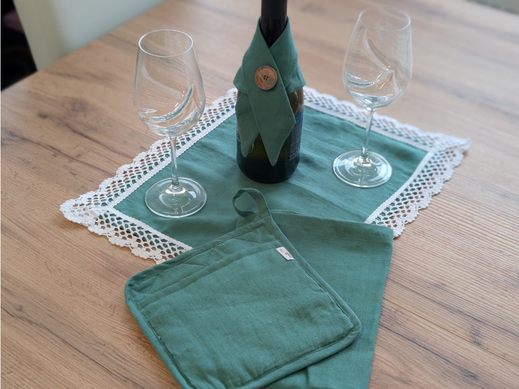 Lněný jídelní set - zelený - prostírání, šála na lahev, utěrka, chňapka
