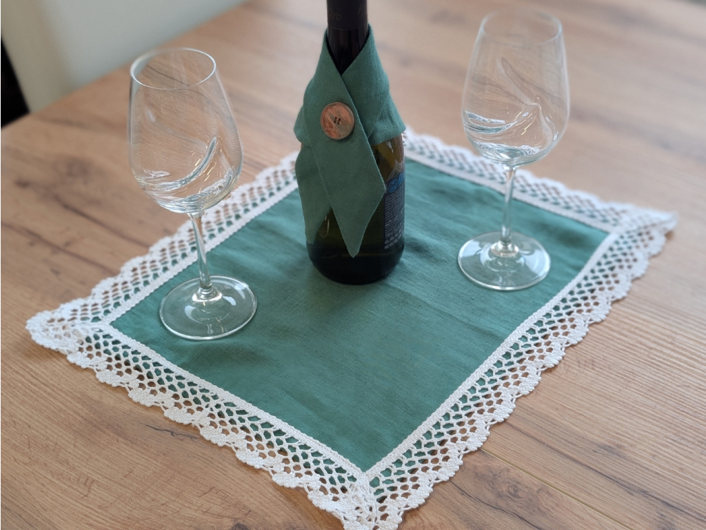 Lněný jídelní set - zelený - prostírání s paličkovanou krajkou a šála na lahev
