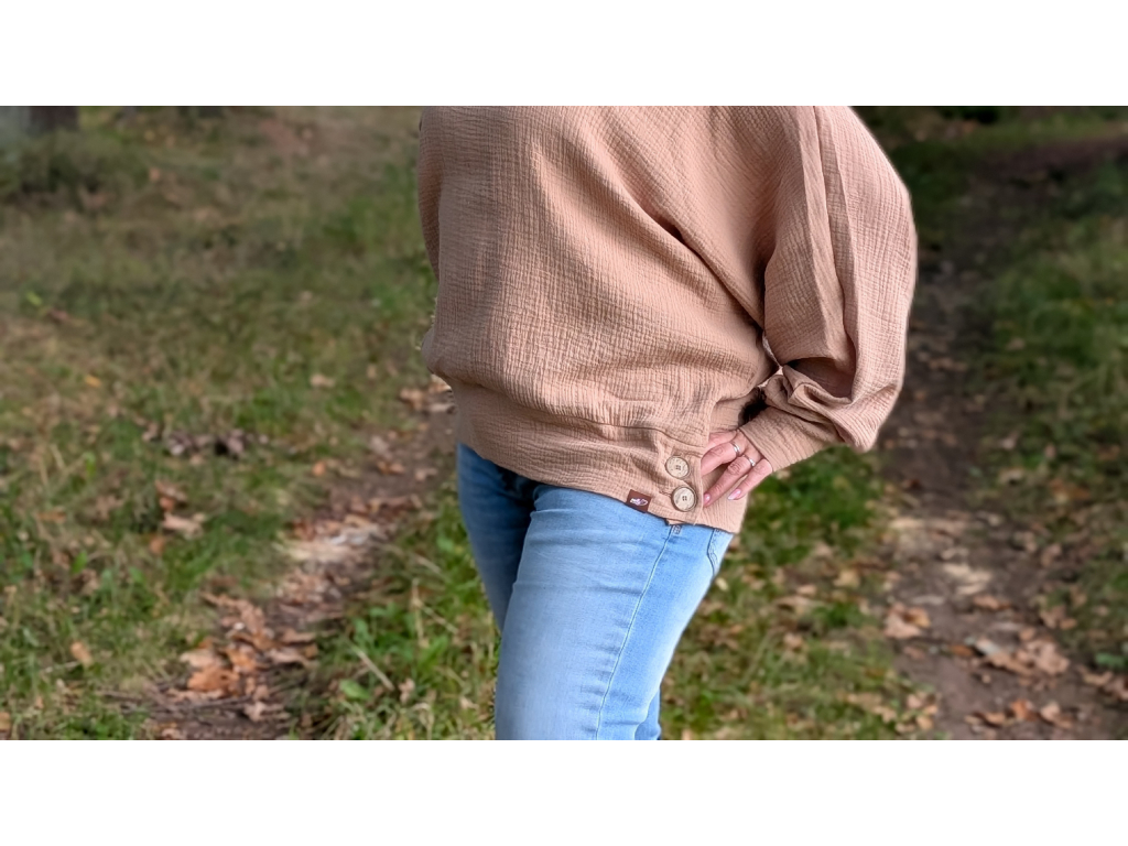 Střih: Volný, netopýří rukávy, spodní lem na knoflíky