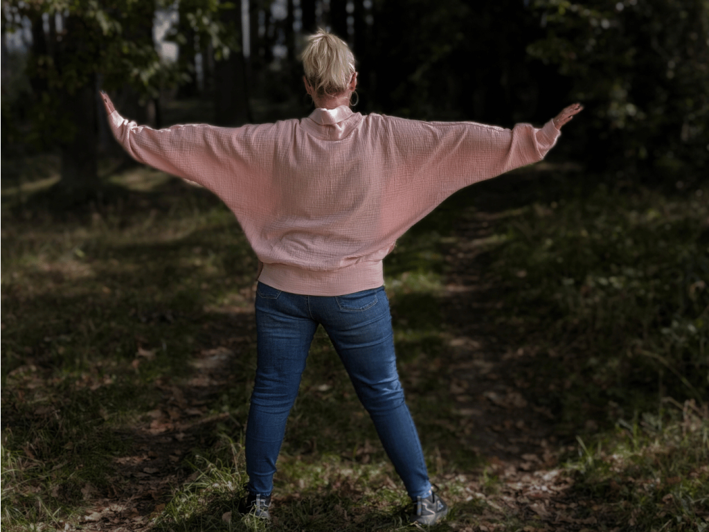 Střih: Volný, netopýří rukávy, spodní lem na knoflíky