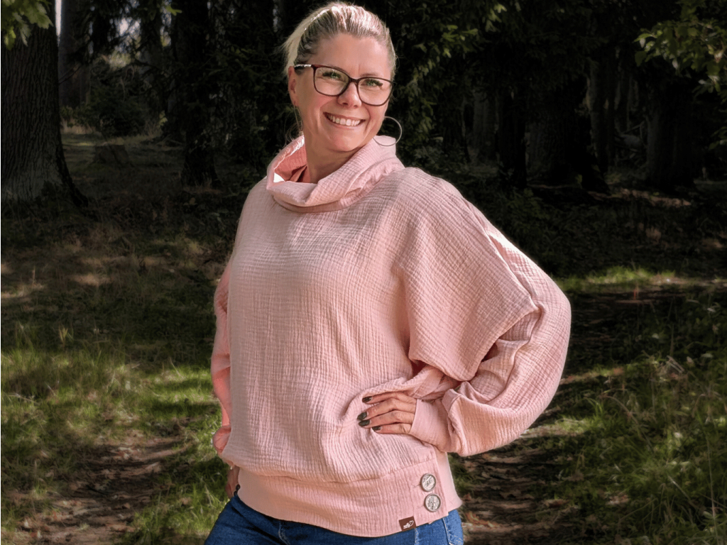 Volný střih s netopýřími rukávy vám dopřeje maximální komfort a volnost pohybu. Stylový roláček dodává mikině elegantní nádech, zatímco spodní lem stažený na knoflíky opticky tvaruje postavu a přidává originální detail.