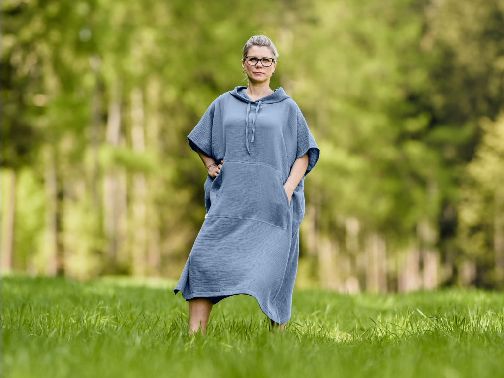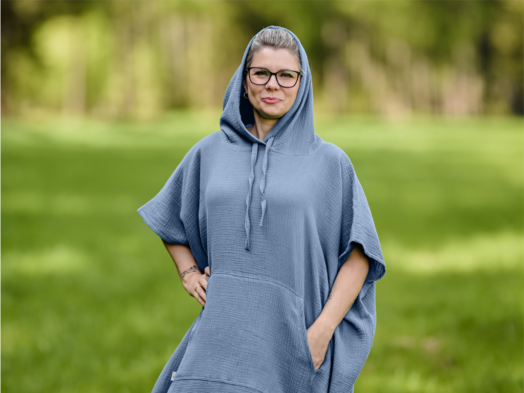 Světle modrá barva přináší pocit svěžesti a klidu. Jemný a prodyšný mušelín je hebký na dotek a příjemný i v teplých dnech. Pončo využijete nejen v létě, ale i při chvilkách odpočinku doma, třeba když si chcete vychutnat ticho, knihu nebo šálek čaje.