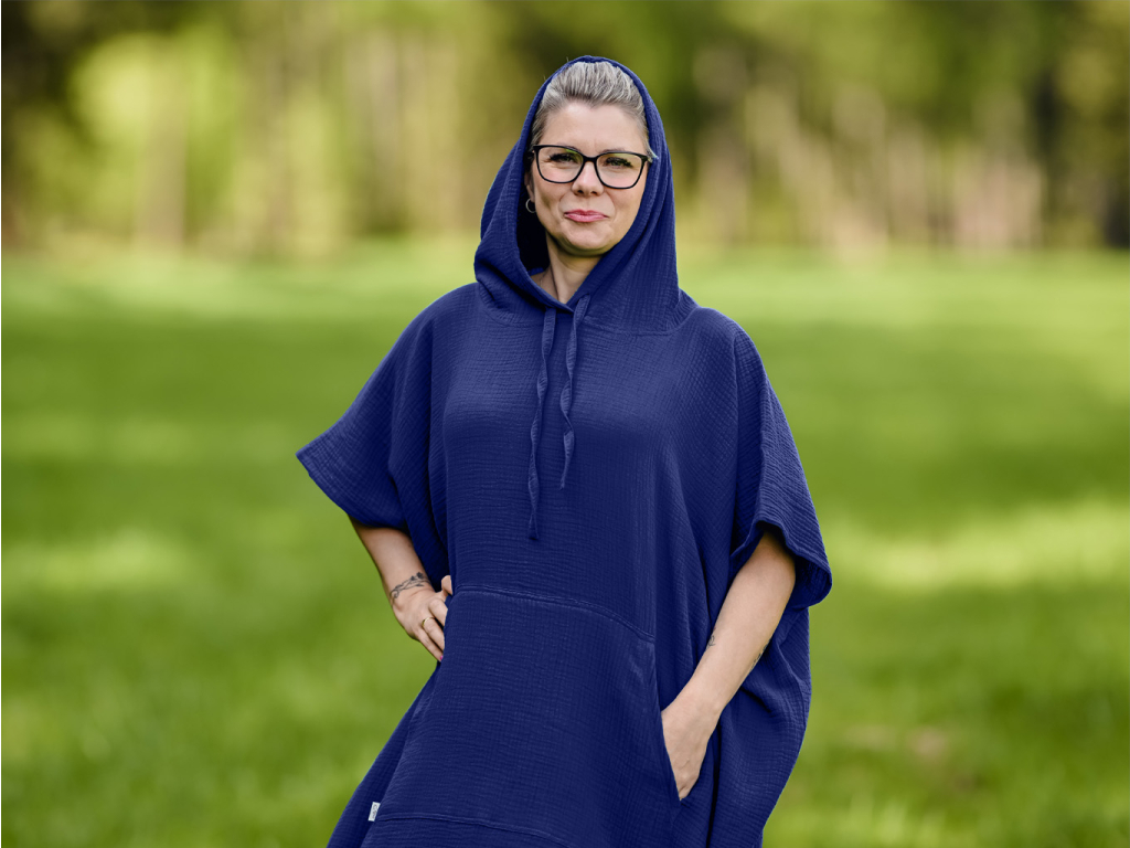 Tmavě modrá barva přináší pocit klidu a pohody. Lehký a prodyšný mušelín je příjemný na dotek a snadno se nosí od léta až po podzim. Pončo si oblíbíte nejen venku, ale i při chvílích odpočinku doma, třeba s oblíbenou knihou nebo šálkem čaje.
