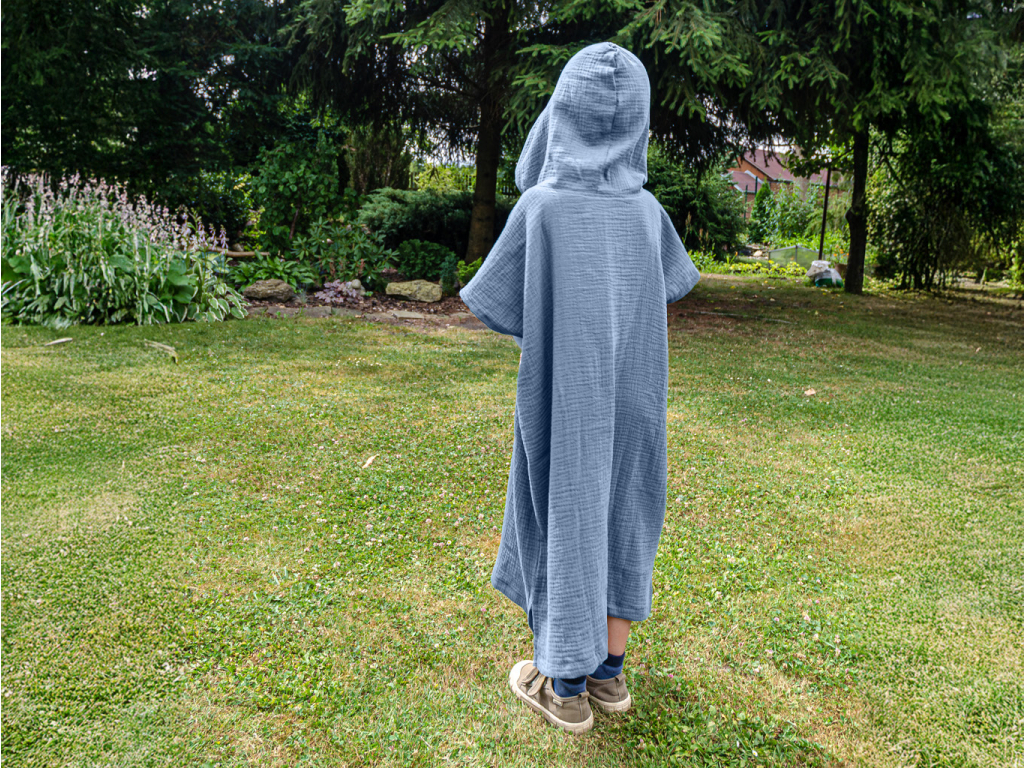 Mušelín ze 100% bavlny je hebký, prodyšný a šetrný k citlivé dětské pokožce. Světle modrá barva působí jemně a svěže, takže pončo sluší klukům i holčičkám. Praktická kapuce ochrání před větrem i kapkami deště a velká klokanka pojme všechny drobné poklady z her. Pončo je lehké, snadno sbalitelné do batůžku a vždy připravené nabídnout pohodlí a teplo, kdykoli je potřeba.