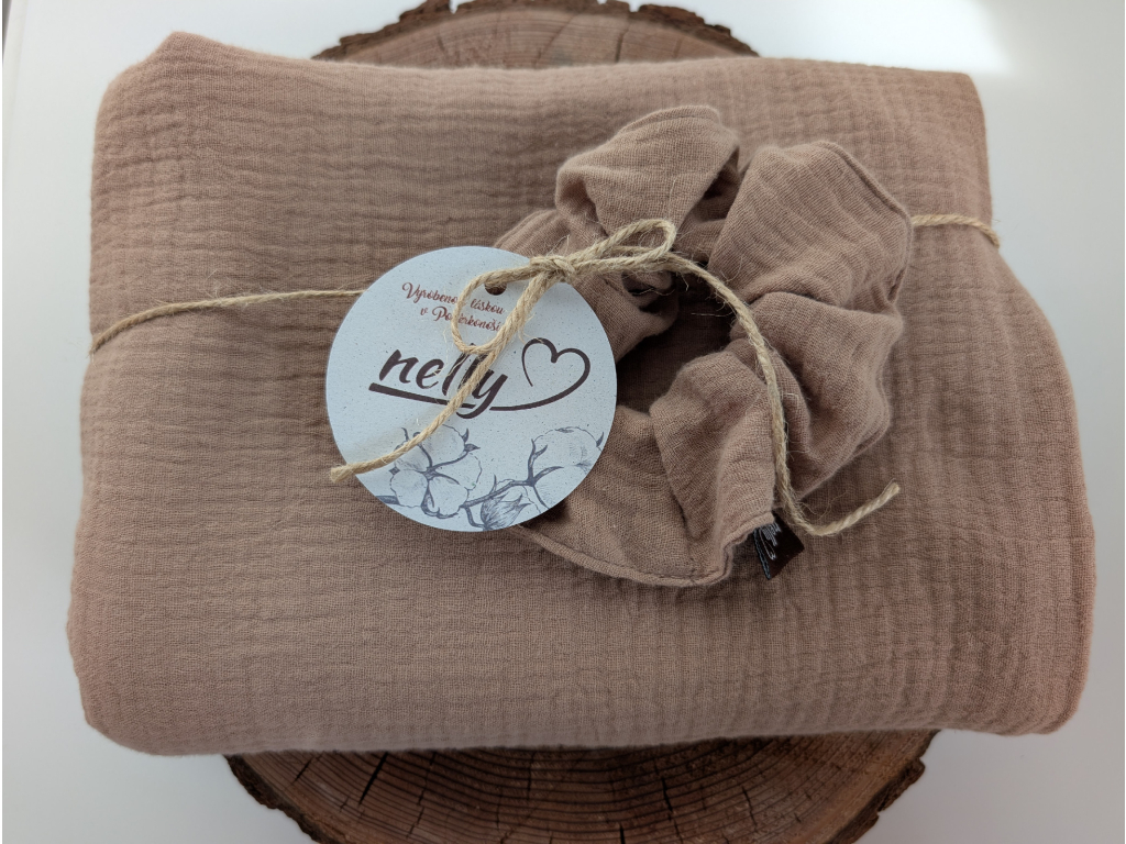 Jemný mušelínový dárkový set v odstínu cappuccino ze 100% bavlny potěší svou hřejivou, neutrální barvou i nadčasovým vzhledem. Ručně šitý v Podkrkonoší a dárkově zabalený – ideální dárek pro milovníky přírodních tónů a kvalitní české výroby.